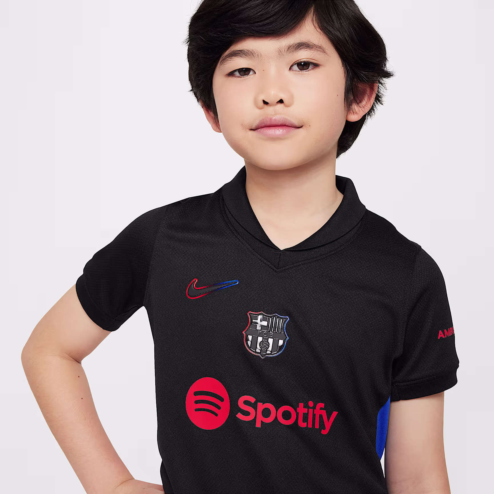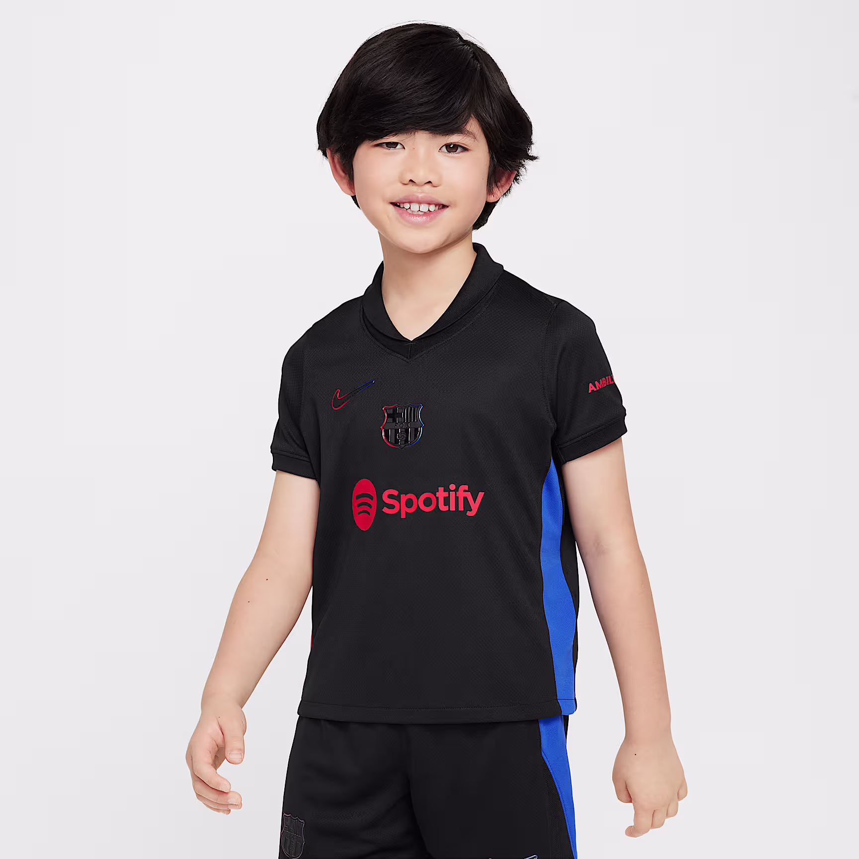 Outfit future little stars in full with this three-piece kit that includes a team shirt with matching shorts and socks. Inspired by what the pros wear during play, our Stadium Collection has lightweight, sweat-wicking fabric to help keep young athletes comfortable while they zoom, scurry or play. This shirt carries the same Spotify logo as prior FCB kits.