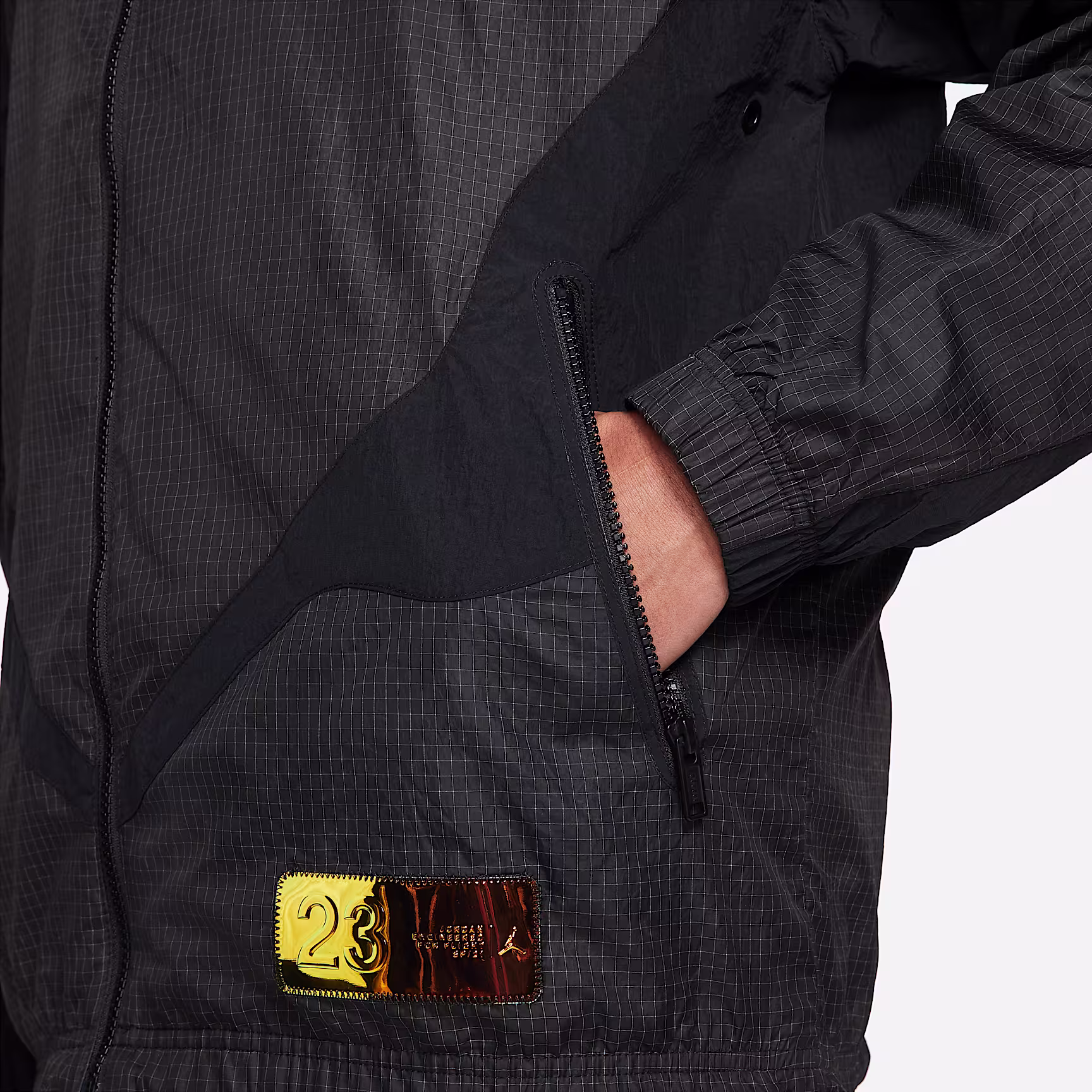 The 23 Engineered Tracksuit Jacket puts a futuristic spin on brand heritage. It's made from waxed Ripstop with crinkle-woven side panels. The jacket comes fully lined and subtly branded with a gold-tone embossed collection label.