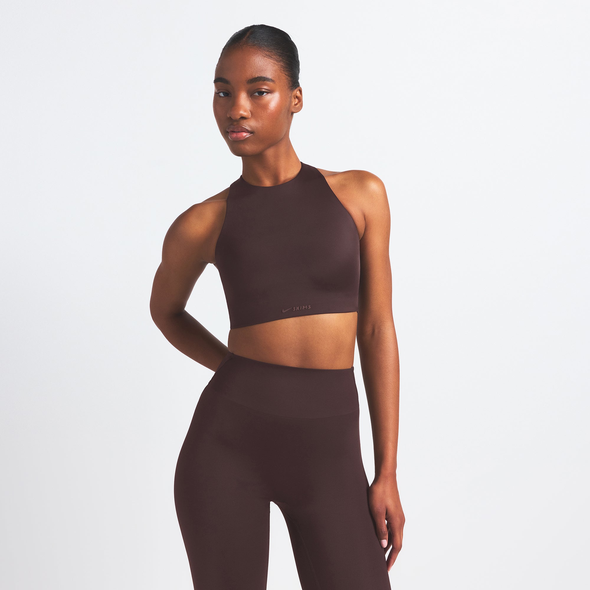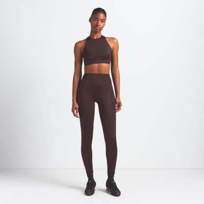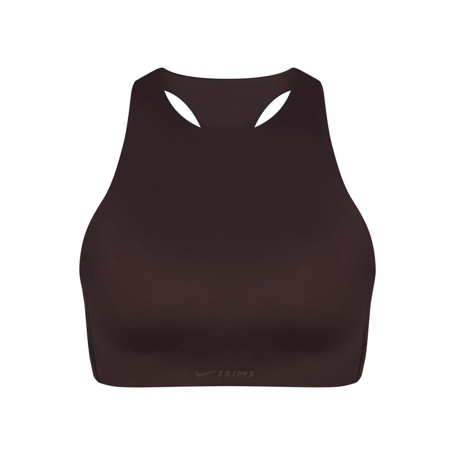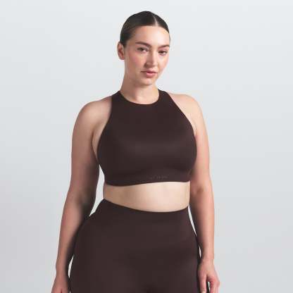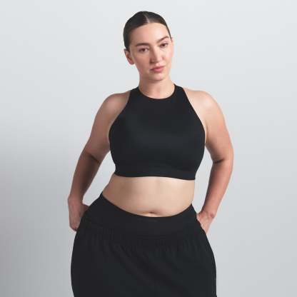 High neck bra, Built in soft lightly molded pads that provide coverage, Silicone matte logo at center front underband, Cut out detail at lower back, Hook and eye closure, Lined in power mesh and internal bonded panels for additional support, Fits tight to body, Best for high impact