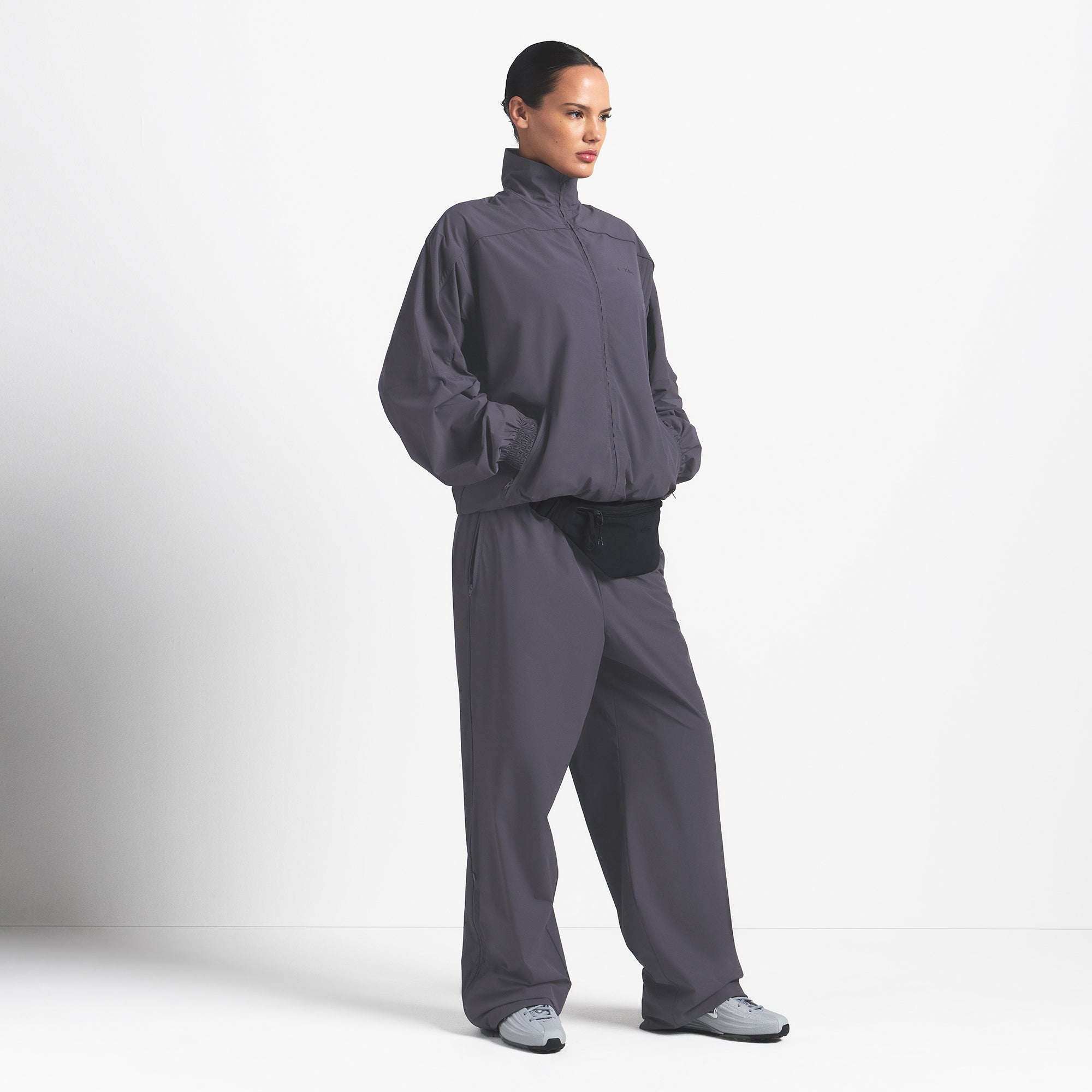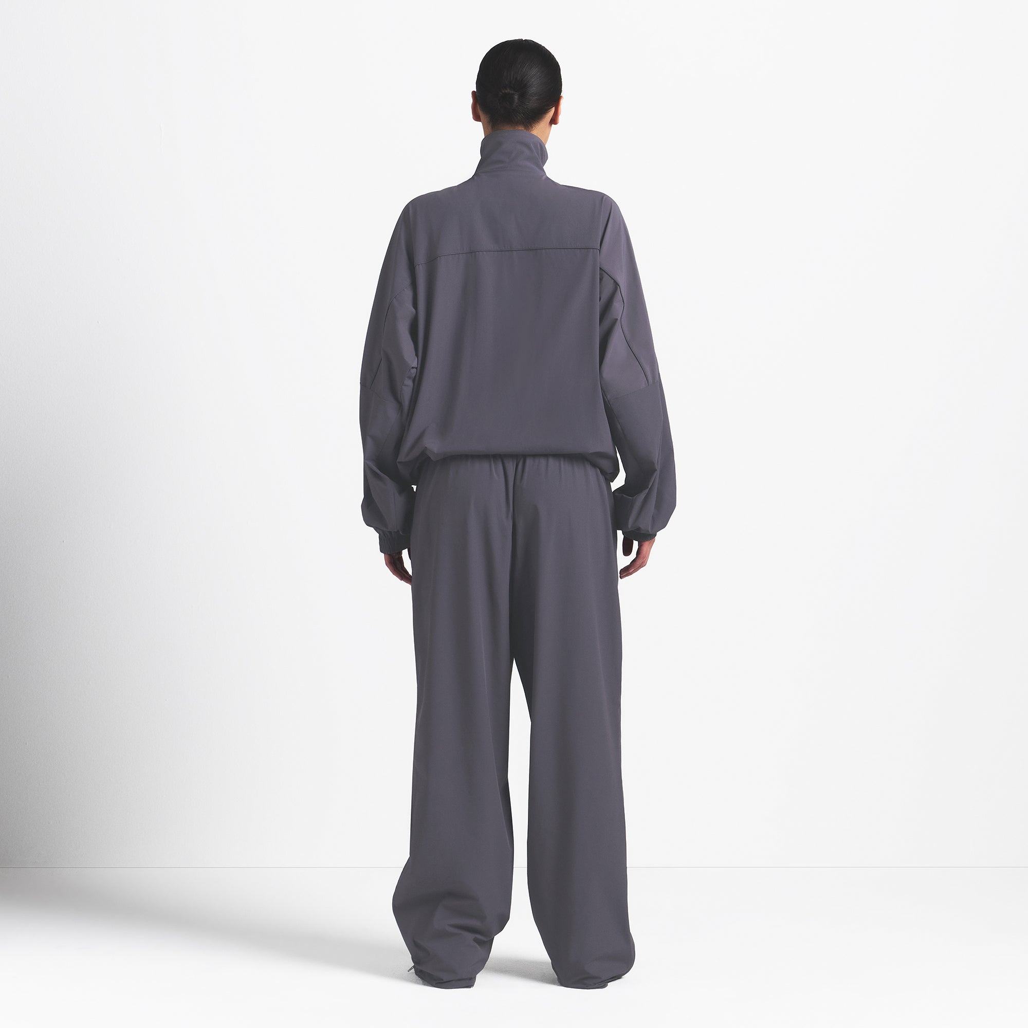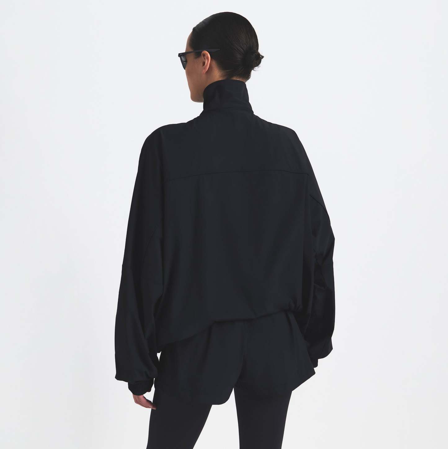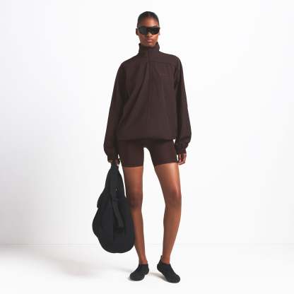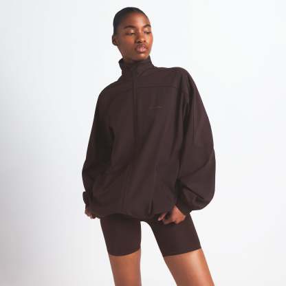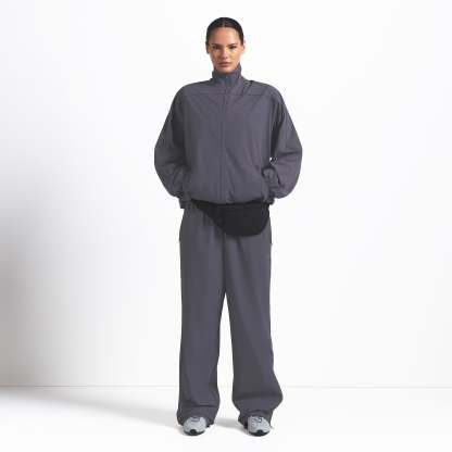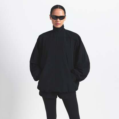This oversized zip-up track jacket is the perfect layer for your workout ensemble. Boasts our lightweight Woven Nylon fabric and features a flattering mock neck and welt zipper pockets. Complete with sporty seam and piping details.
