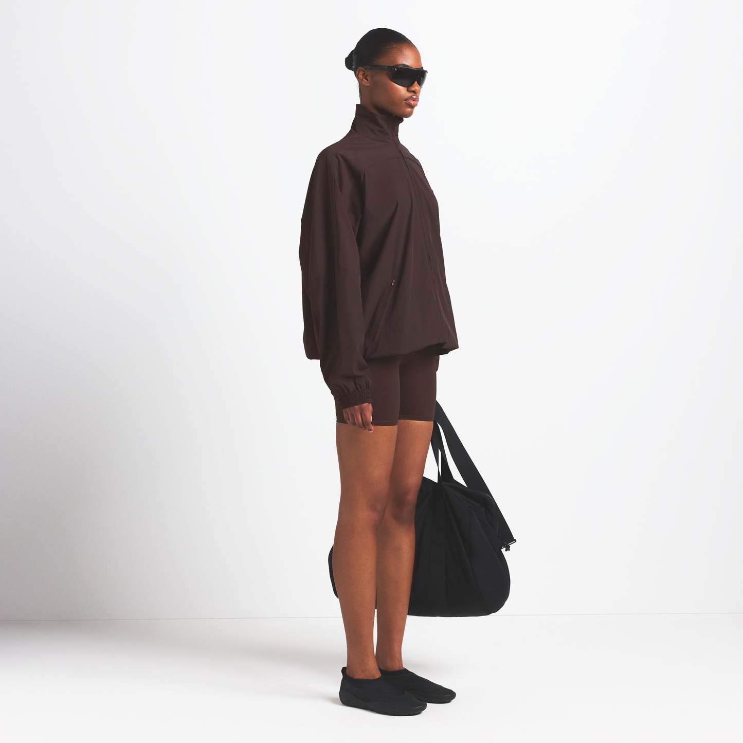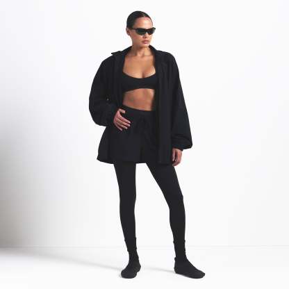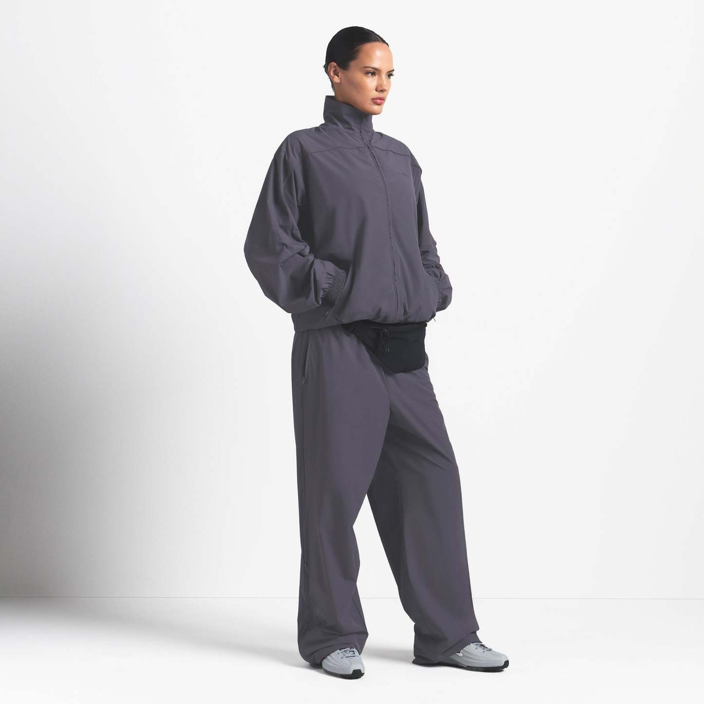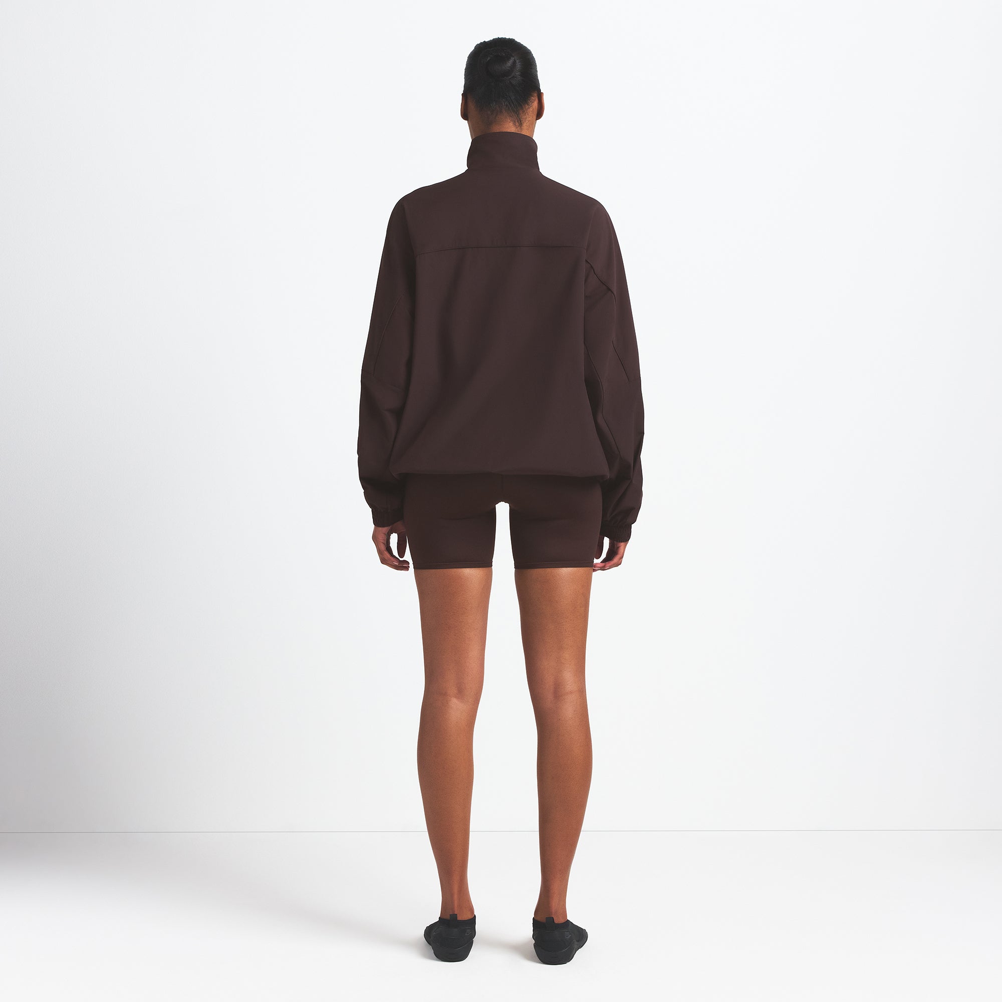 This oversized zip-up track jacket is the perfect layer for your workout ensemble. Boasts our lightweight Woven Nylon fabric and features a flattering mock neck and welt zipper pockets. Complete with sporty seam and piping details.
