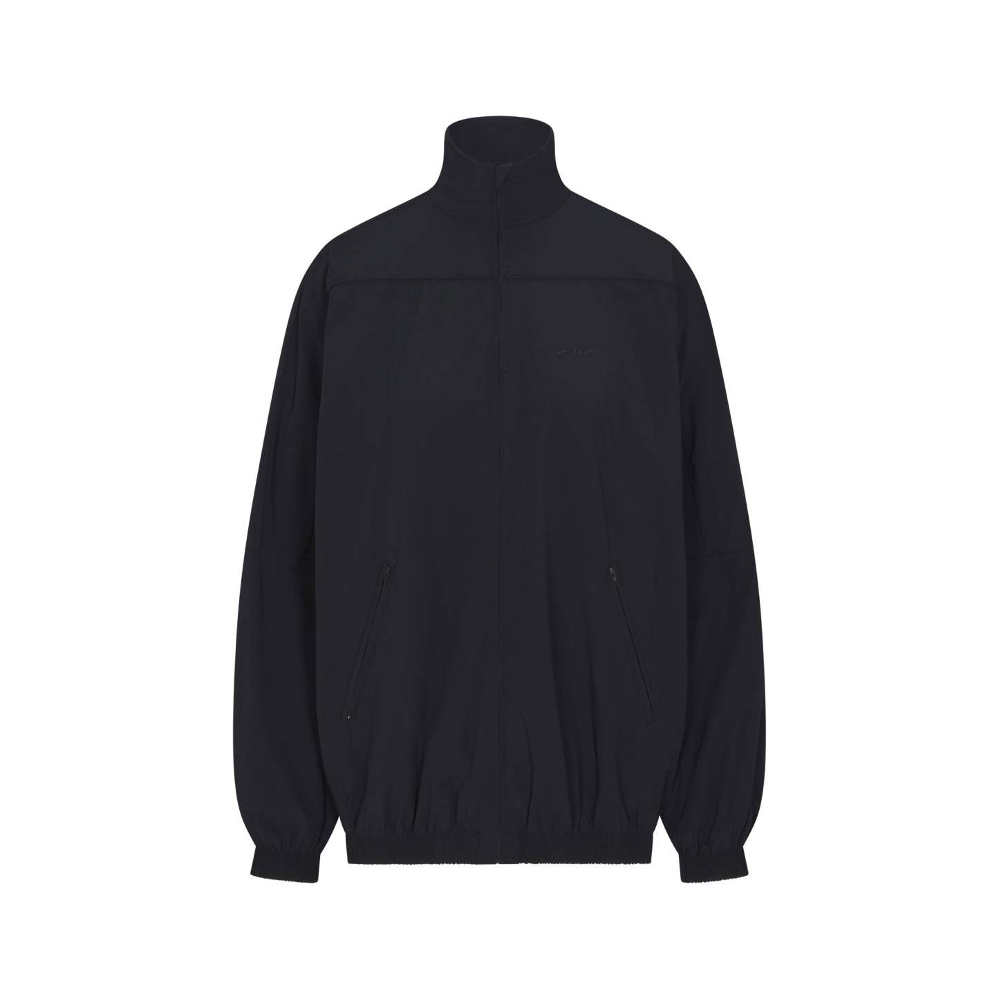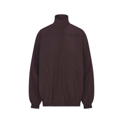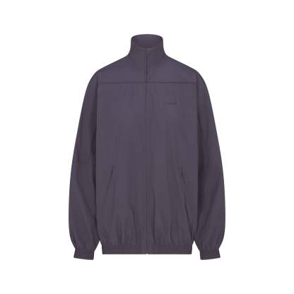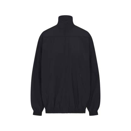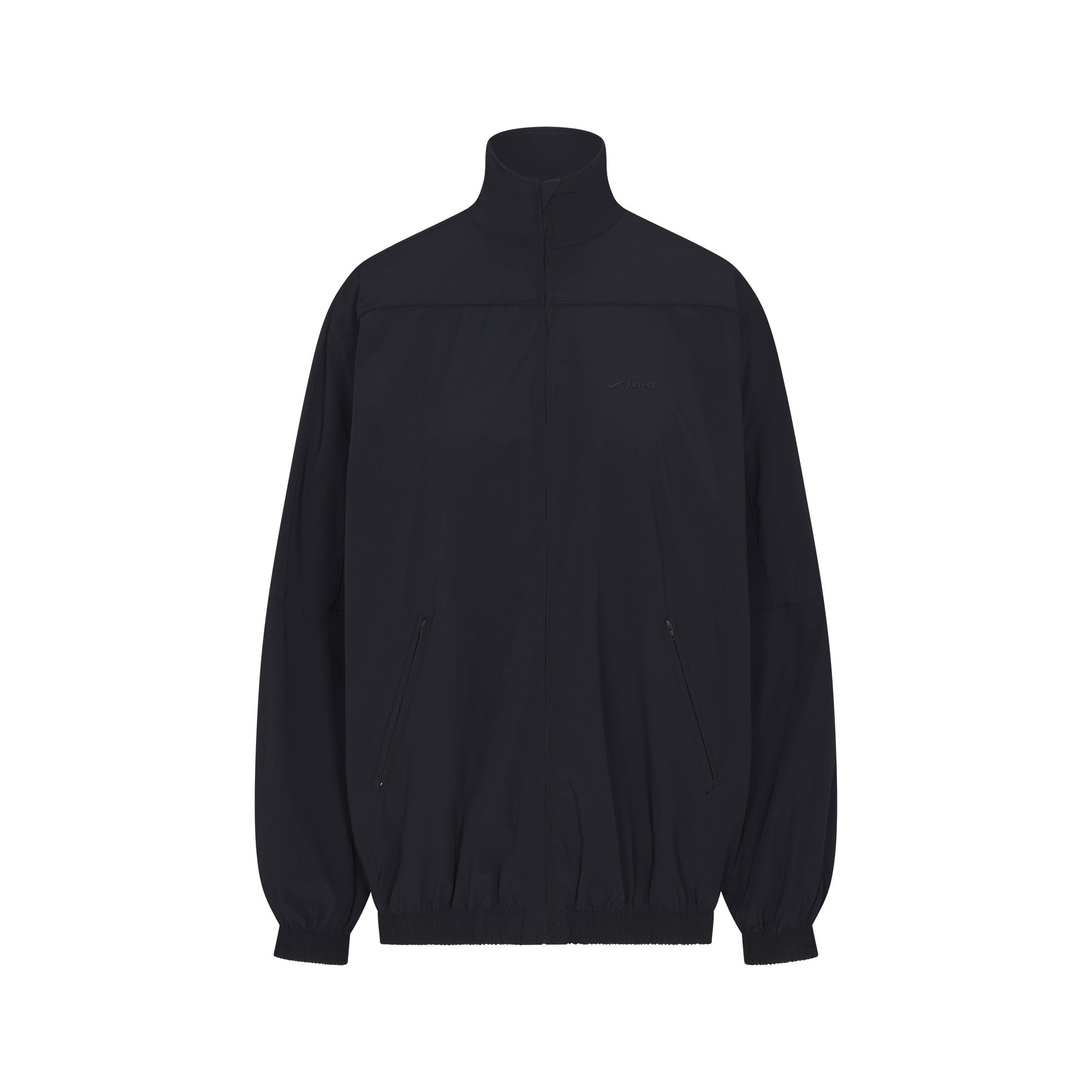 Mock neck, Long sleeves with drop shoulder, Full zip closure, Welt pockets with zipper closure, Elastic at cuff and hem, Front side and back seam details, Piping detail at front and back, Silicone matte logo at wearers left chest, Lined in a soft sports mesh, Oversized fit