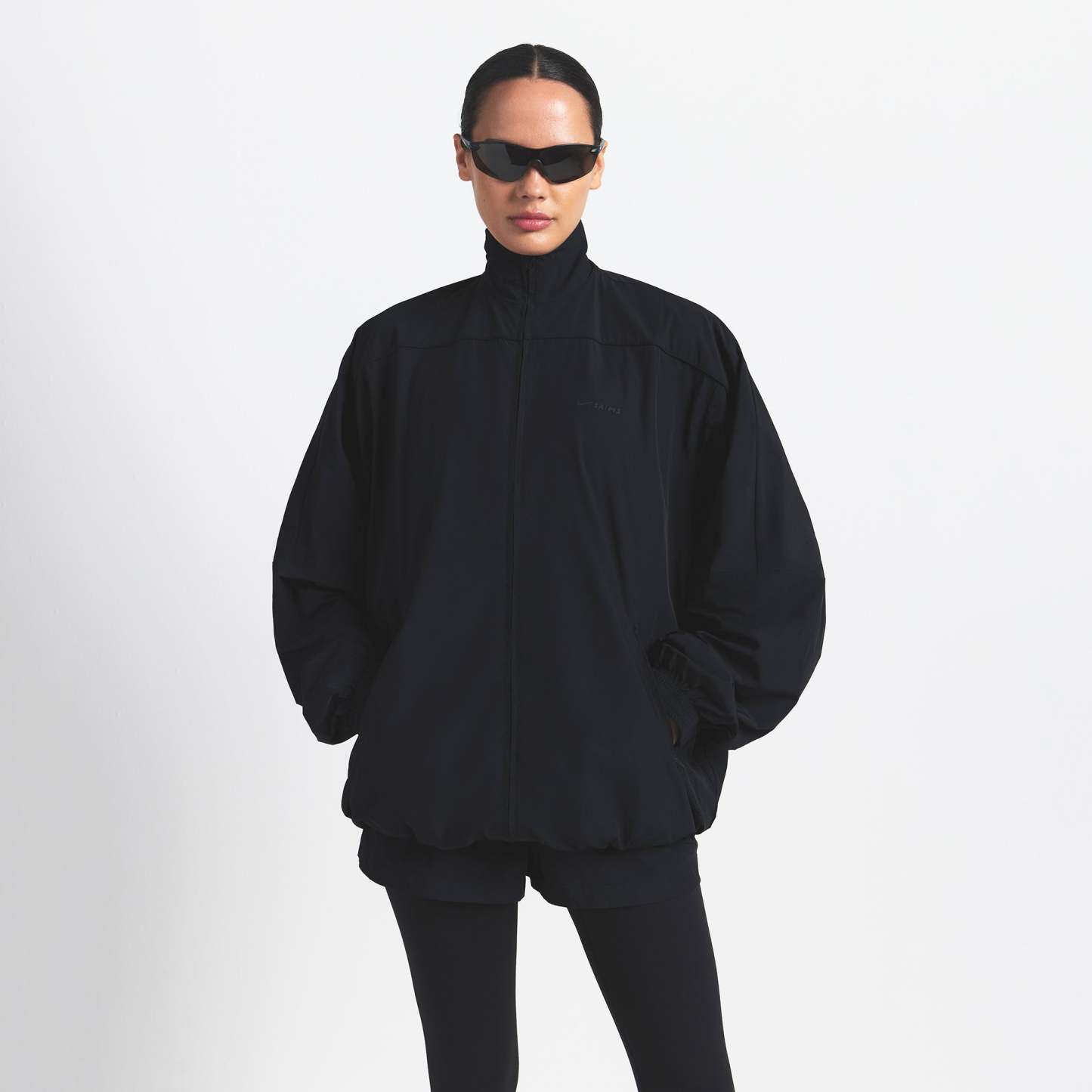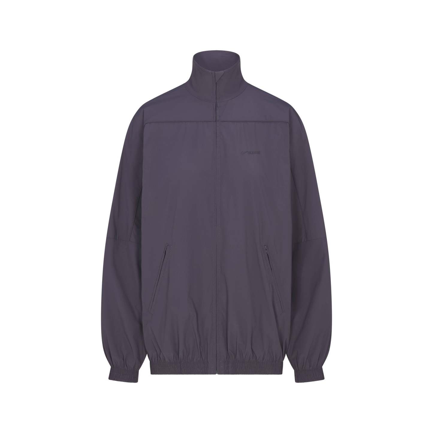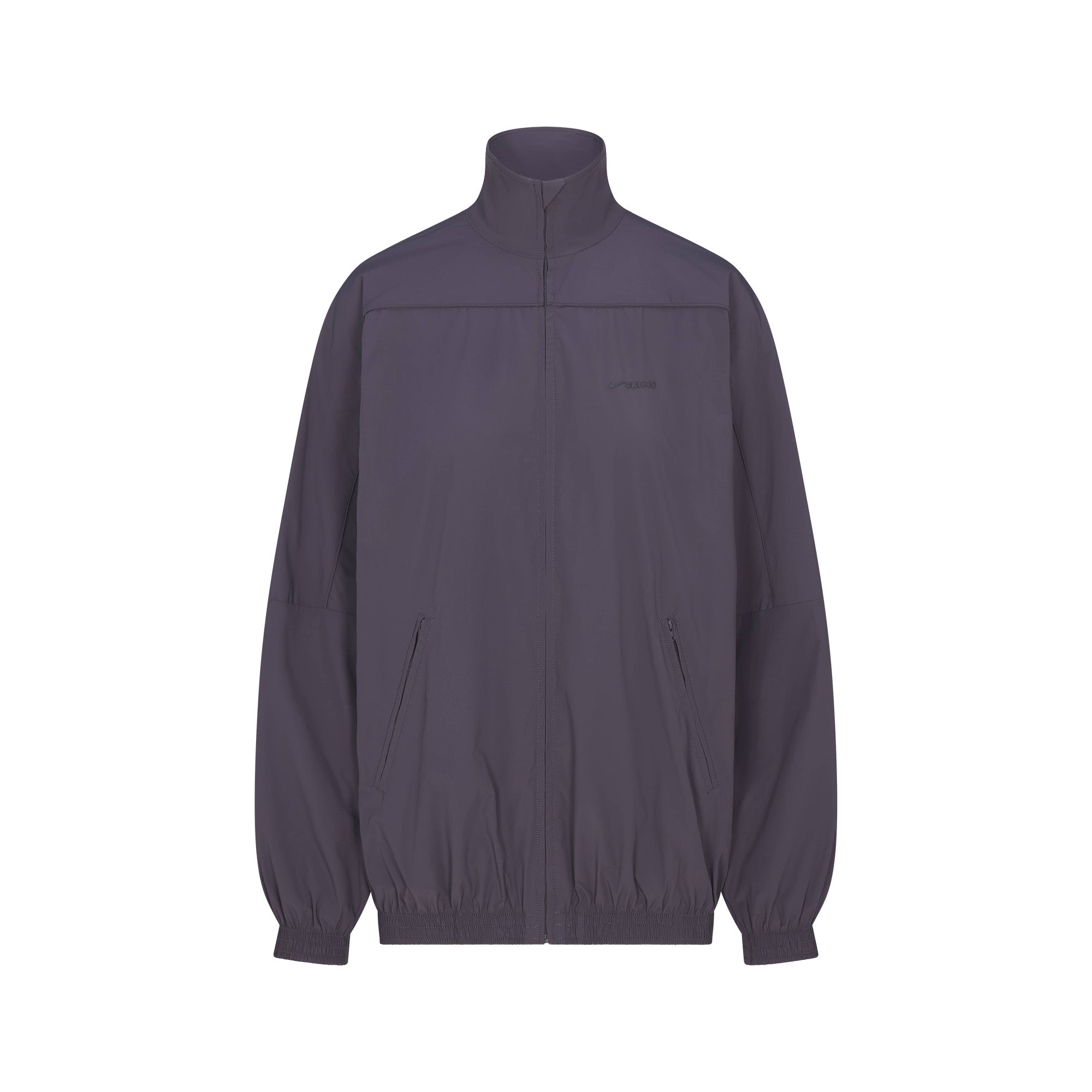 Mock neck, Long sleeves with drop shoulder, Full zip closure, Welt pockets with zipper closure, Elastic at cuff and hem, Front side and back seam details, Piping detail at front and back, Silicone matte logo at wearers left chest, Lined in a soft sports mesh, Oversized fit