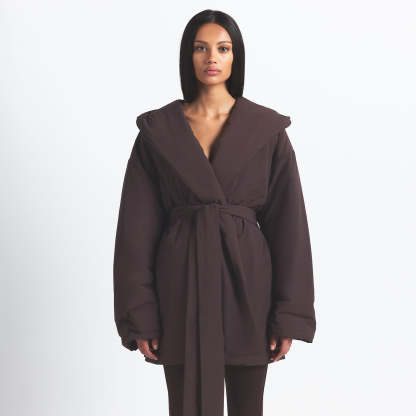 Soft Poly Fill Puffer Wrap Style, Shawl Collar, Hood, Side Pockets With Zipper Details