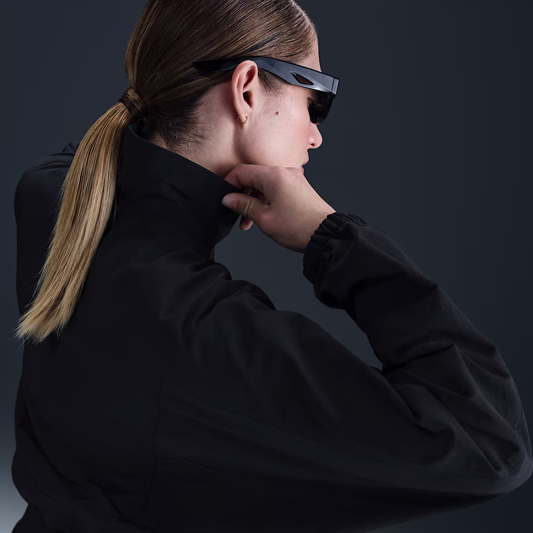 Simplicity and functionality come together in this lightweight jacket. Textured, water-repellent nylon and an elongated collar help keep you covered come rain or shine. Angled seams and a cropped length add dimension to the oversized fit.