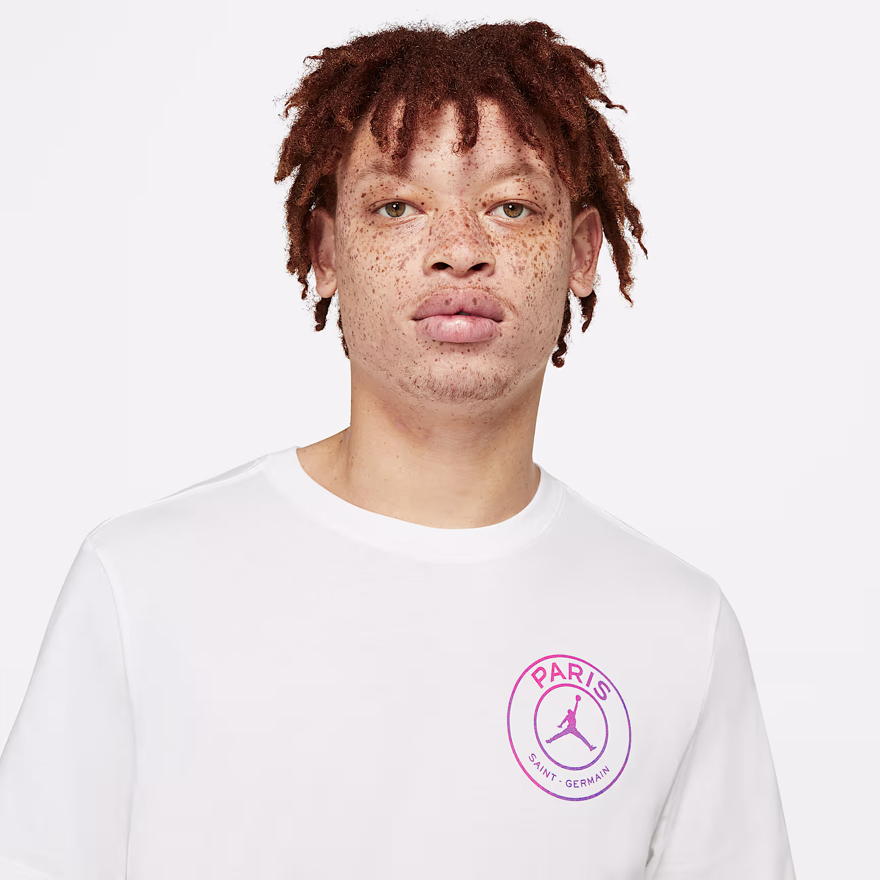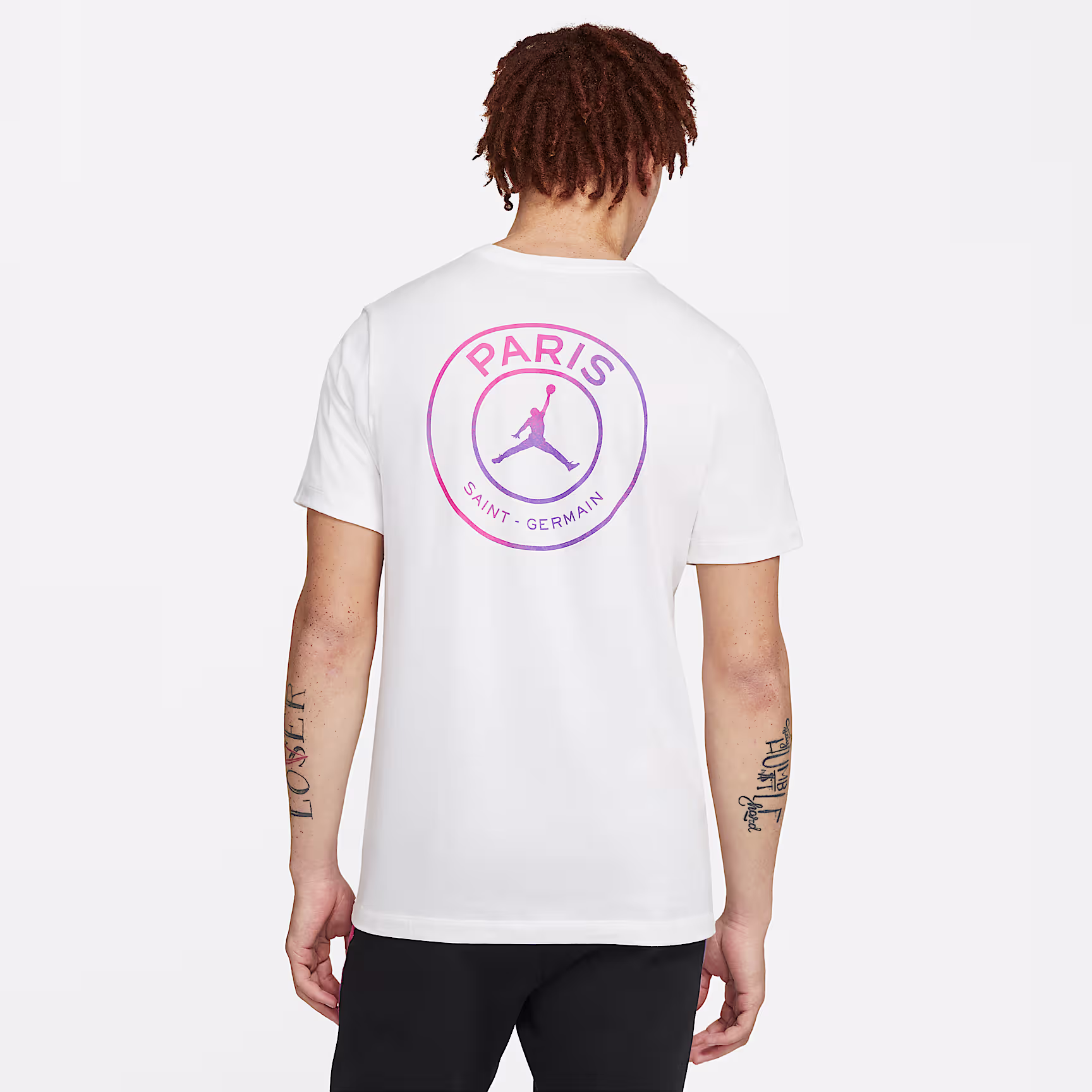 Rep 2 legendary sides. New colours inspired by the club's 4th kit distinguish the Paris Saint-Germain T-Shirt. It's a cotton-made crew featuring a vibrant, colour-shifting jock tag and Paris/Jordan collaboration crest.